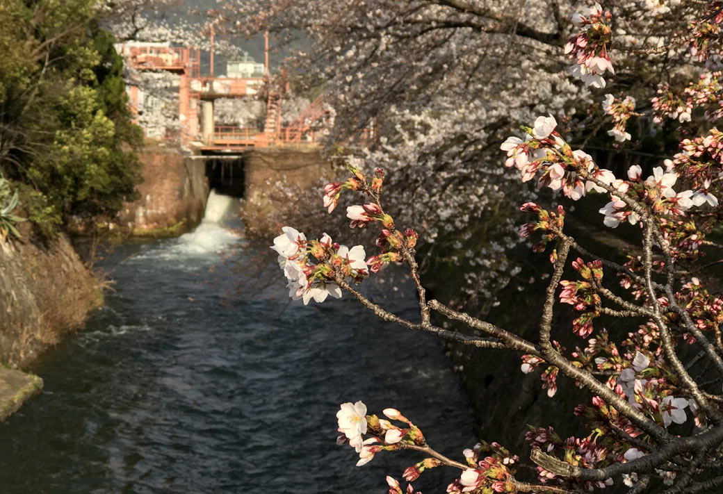 This water comes from Lake Biwa through many tunnels. And here in Kyoto it is used as drinking water and electricity. Look the water gate bihind Sakura, there is a power station.