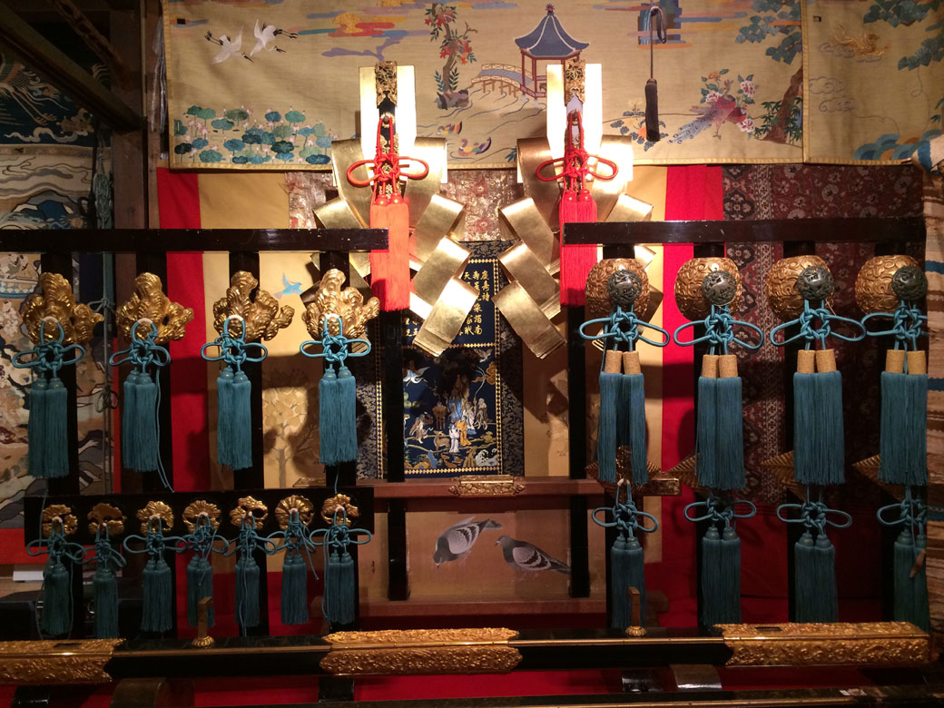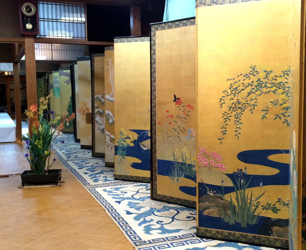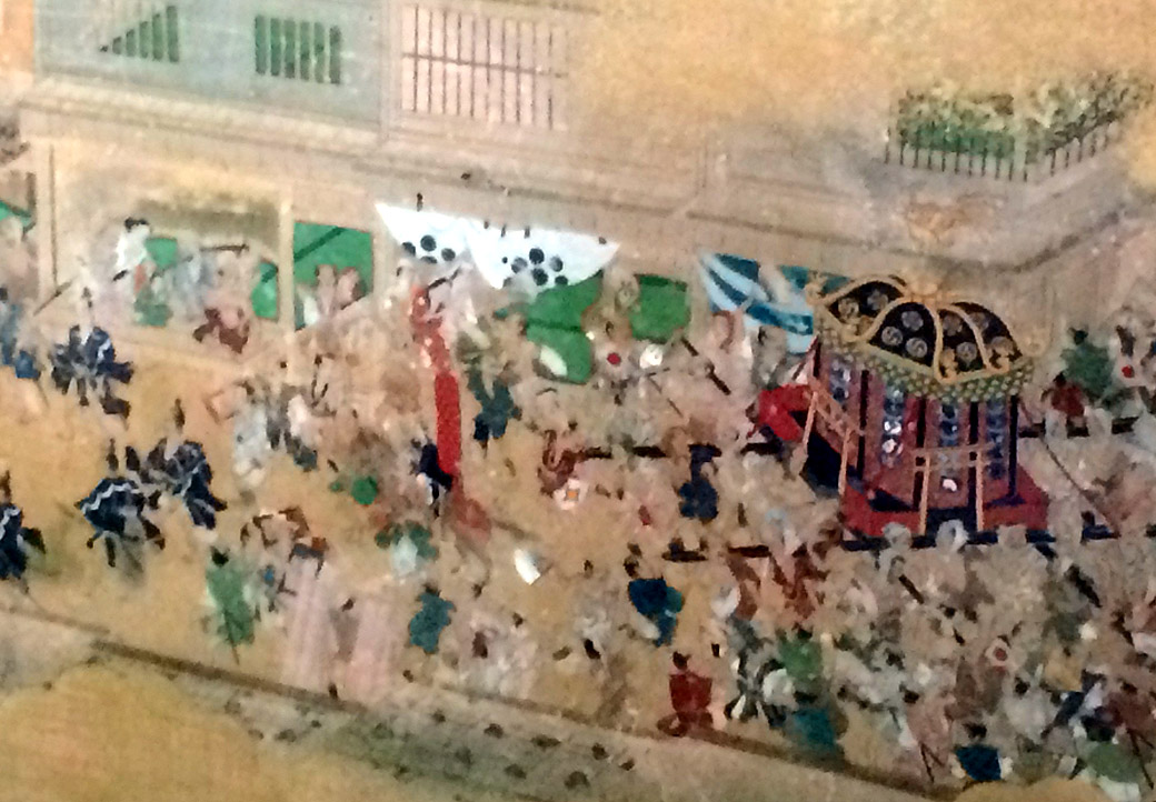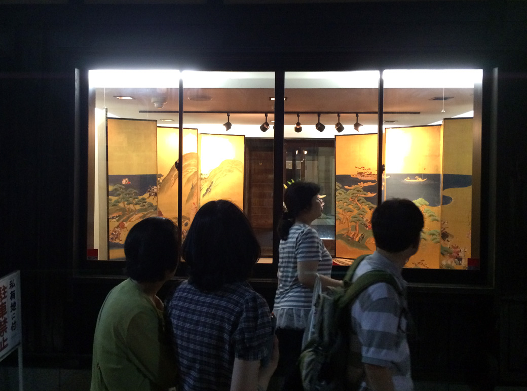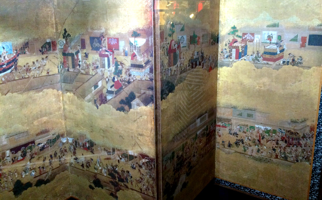 During these Yoiyama nights, in the Yamahoko-cho area Kyomachiya (old family houses and established business houses of Kyotian-style) remove the lattice doors and show what is called “Byobu-kazari” (the decoration with their family heirlooms and folding screens). So the event is also known as the Byobu Matsuri or Folding Screen Festival.