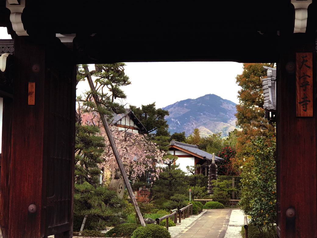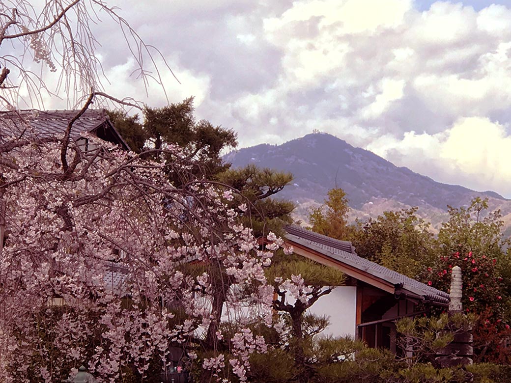 The cherry tree and Mt. Hiei are picturesque in the gate.
